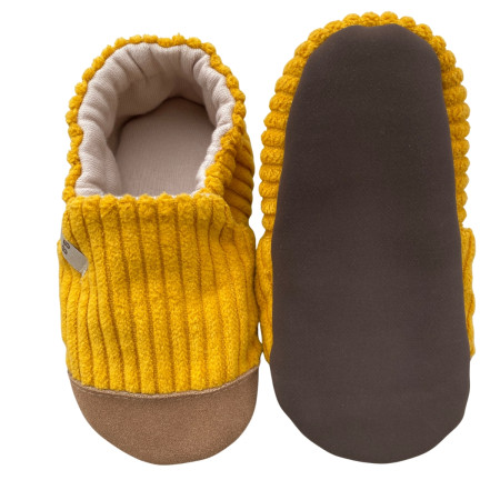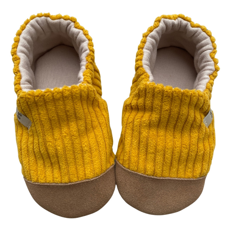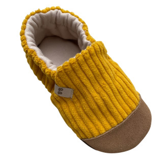 Niezwykle lekkie, oddychające i super wygodne kapcie w złocistożółtym kolorze (sztruks w grube prążki) wykończone karmelowymi noskami. Idealne dla dzieci raczkujących, stawiających pierwsze kroki jak i dla starszych. Kapcie marki Baby Bisous to najwygodniejsze obuwie do przedszkola, żłobka i po domu. Łatwo się je zakłada i zdejmuje dzięki temu, że nie posiadają skomplikowanego zapięcia. Na stopach trzymają się dzięki gumce wszytej w tylnej części papci. Posiadają miękką, antypoślizgową podeszwę, która naturalnie pracuje razem ze stopą. Dbając o każdy szczegół, wykorzystujemy najlepsze jakościowo materiały, a wszystkie szwy skrzętnie ukrywamy. Wierzchnia część papci wykonana jest z mocnej, odpornej na przetarcia tkaniny. Palce są dodatkowo wzmocnione. Wewnętrzna część to miękka oddychająca bawełna. Rzeczywisty kolor kapci może różnić się ze względu na indywidualne ustawienia monitora. Rozmieszczenie wzoru może różnić się od przedstawionego na zdjęciu. Produkt w całości szyty ręcznie w Polsce.