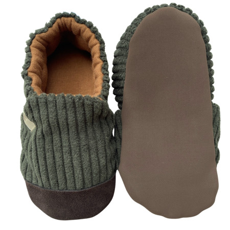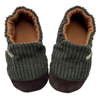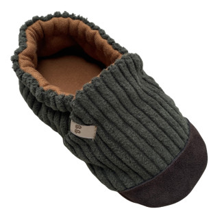 Niezwykle lekkie, oddychające i super wygodne kapcie w zielonym kolorze (sztruks w grube prążki) wykończone czekoladowymi noskami. Idealne dla dzieci raczkujących, stawiających pierwsze kroki jak i dla starszych. Kapcie marki Baby Bisous to najwygodniejsze obuwie do przedszkola, żłobka i po domu. Łatwo się je zakłada i zdejmuje dzięki temu, że nie posiadają skomplikowanego zapięcia. Na stopach trzymają się dzięki gumce wszytej w tylnej części papci. Posiadają miękką, antypoślizgową podeszwę, która naturalnie pracuje razem ze stopą. Dbając o każdy szczegół, wykorzystujemy najlepsze jakościowo materiały, a wszystkie szwy skrzętnie ukrywamy. Wierzchnia część papci wykonana jest z mocnej, odpornej na przetarcia tkaniny. Palce są dodatkowo wzmocnione. Wewnętrzna część to miękka oddychająca bawełna. Rzeczywisty kolor kapci może różnić się ze względu na indywidualne ustawienia monitora. Rozmieszczenie wzoru może różnić się od przedstawionego na zdjęciu. Produkt w całości szyty ręcznie w Polsce.