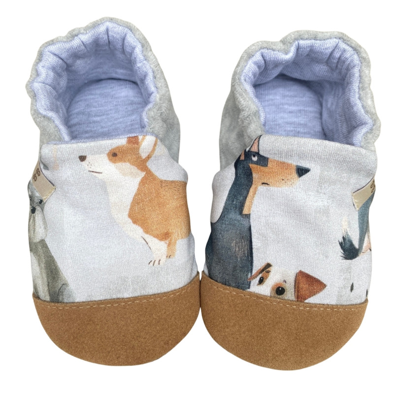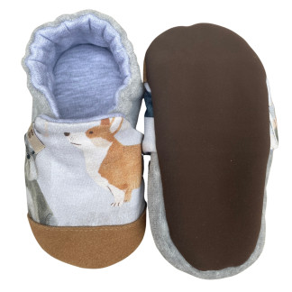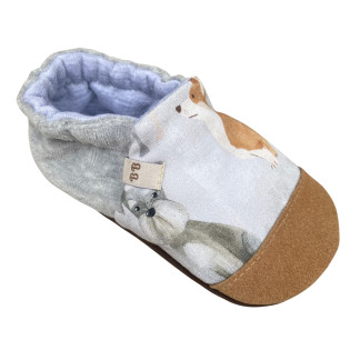 Niezwykle lekkie, oddychające i super wygodne kapcie w zwierzęcy wzór (dresówka) w połączeniu z siwym (welur) wykończone karmelowymi noskami (skóra naturalna). Idealne dla dzieci raczkujących, stawiających pierwsze kroki jak i dla starszych. Kapcie marki Baby Bisous to najwygodniejsze obuwie do przedszkola, żłobka i po domu. Łatwo się je zakłada i zdejmuje dzięki temu, że nie posiadają skomplikowanego zapięcia. Na stopach trzymają się dzięki gumce wszytej w tylnej części papci. Posiadają miękką, antypoślizgową podeszwę, która naturalnie pracuje razem ze stopą. Dbając o każdy szczegół, wykorzystujemy najlepsze jakościowo materiały, a wszystkie szwy skrzętnie ukrywamy. Wierzchnia część papci wykonana jest z mocnej, odpornej na przetarcia tkaniny. Palce są dodatkowo wzmocnione. Wewnętrzna część to miękka oddychająca bawełna. Rzeczywisty kolor kapci może różnić się ze względu na indywidualne ustawienia monitora. Rozmieszczenie wzoru może różnić się od przedstawionego na zdjęciu. Produkt w całości szyty ręcznie w Polsce.
